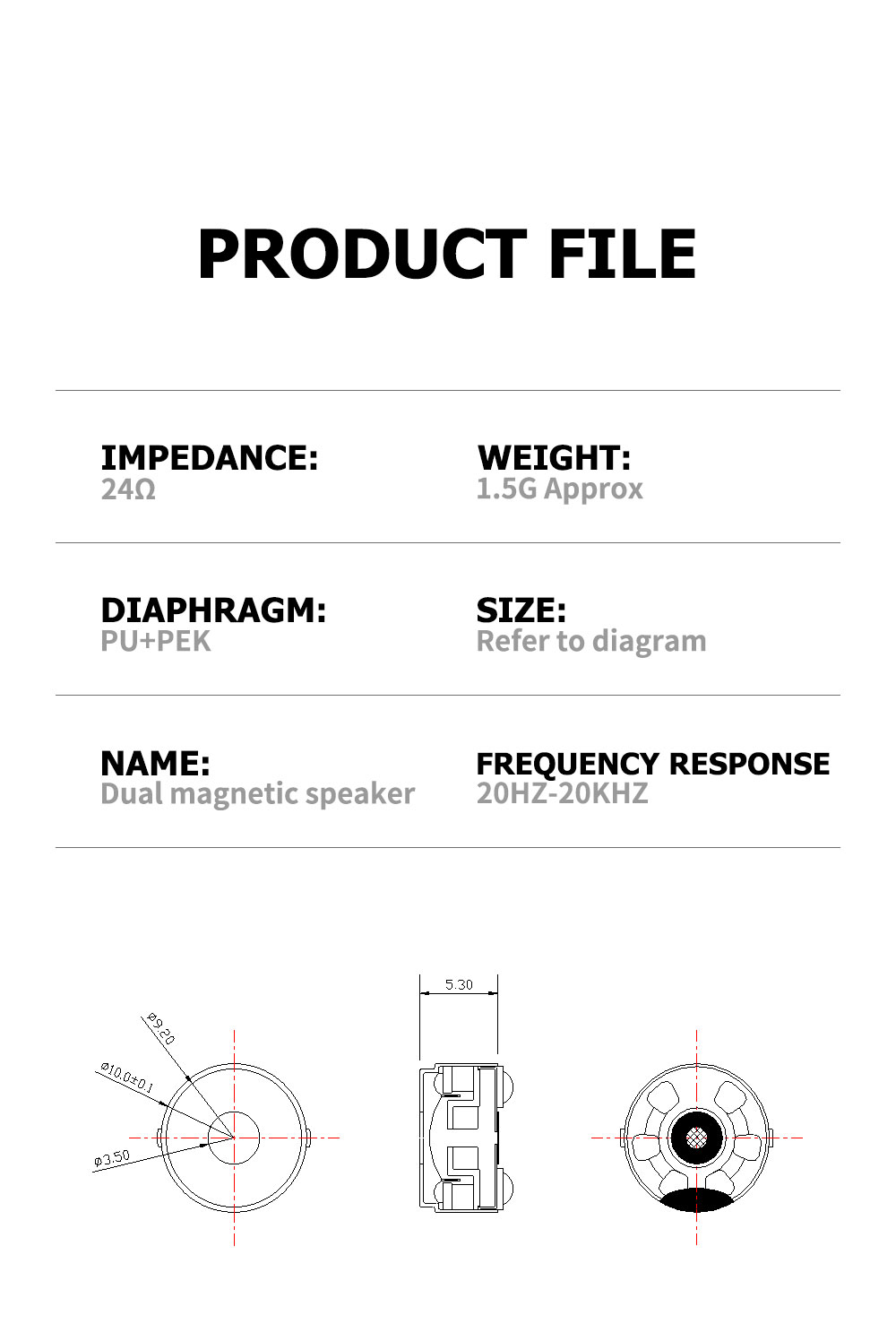 10MM PU+PEK EARPHONE SPEAKER IMPEDANCE:24Ω WEIGHT:1.5G Approx GRÖßE:Refer to diagram DIAPHRAGM:PU+PEK NAME:Dual magnetic speaker FREQUENCY RESPONSE:20HZ-20KHZ Anfrage senden Live-Chat Produktdetails Packing & Delivery Schilder:Harman curve trendPerfect combination of PU and PEKStable and durable with excellent sound quality Freigeben: Auf Facebook (Englisch)ZwitschernLinkedIn (Englisch)WhatsApp (Englisch) Zurück: 6MM+8MM EARPHONE SPEAKER Verwandte Produkte 6MM+8MM EARPHONE SPEAKER 7.2MM DIY KOPFHÖRER-LAUTSPRECHER 10MM LCP+PU KOPFHÖRER-LAUTSPRECHER 10MM DOPPELT MAGNETISCH 10MM PU KOPFHÖRER LAUTSPRECHER HALBZEUGE 8 KERNKABEL heiße Produkte NEUZUGANG TYP-C DREI-IN-EINS 10MM PAPIER-KOPFHÖRER 10MM DOPPELT MAGNETISCH MMCX-BUCHSE HIFI-AUDIO-ADAPTERKABEL 8 KERN DIGITALE LADE-SOUNDVERSTÄRKER